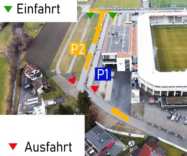 Der Parkplatz P2 westlich der Zufahrtsstraße ist außerhalb von Spieltagen bzw. Großveranstaltungen geschlossen.